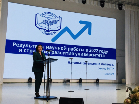С докладом на тему «Результаты научной работы в 2022 году и стратегии развития университета» выступила ректор Минского государственного лингвистического университета Наталья Евгеньевна Лаптева. «Результаты 2022 года в сопоставительном анализе с 2021 годом по всем направлениям показали динамичное движение вперёд. Стоит отметить, что наш университет является также научной организацией: мы получили свидетельство об аккредитации, осуществляемой Государственным комитетом по науке и технологиям Республики Беларусь. Для того чтобы соответствовать заявленному уровню и двигаться дальше, мы определяем для себя в новой редакции Устава университета в качестве одной из основных задач обеспечение устойчивого развития в трех направлениях: научном, научно-исследовательском и инновационном», – отметила Наталья Евгеньевна.